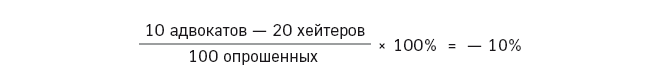 Итак, у вас получилось какое-то число хейтеров, нейтралов и адвокатов. Считаем их сумму по каждой категории и вычисляем NPS по формуле: