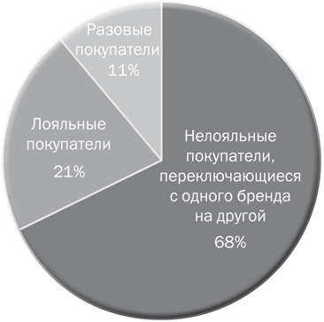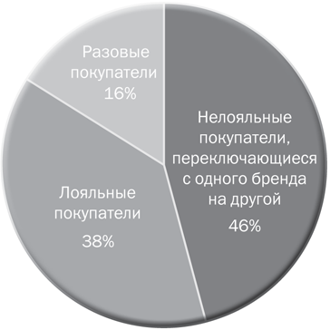 Доля продаж пасты Colgate за счет лояльных покупателей почти вдвое уступает доле продаж пасты Crest за счет ее лояльных потребителей, причем к ним отнесены все, кто за исследуемый период при покупке зубной пасты в большинстве случаев предпочел именно этот бренд. Продажи Colgate в более значительной степени зависят от нелояльных покупателей, или переключающихся – тех, кто за исследуемый период хотя бы один раз приобрел Colgate, хотя в большинстве случаев покупал зубную пасту других брендов.