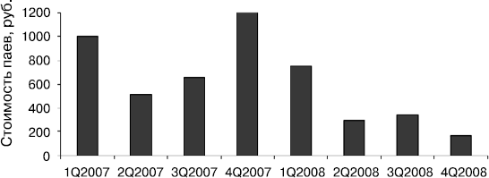 Рис. 9.2. Динамика продаж паев ОПИФ «Райффайзен-Акции» с января 2007 по декабрь 2008 года (поквартально)