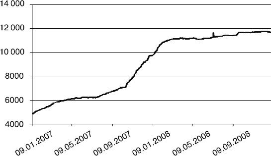 Рис. 9.1. Стоимость пая в ОПИФ «Райффайзен-Акции», зафиксированная с января по октябрь 2008 года