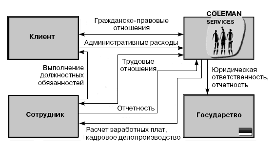 Схему взаимоотношений сторон при аутстаффинге компания Coleman Services отразила следующим образом (рис. 8.1).