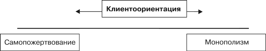 Предельные случаи клиентоориентации – монополизм и самопожертвование (рис. 1.4). Минусы монополизма: нет стимула к развитию, исчезает любознательность, азарт, жиреешь, наглеешь, перестаешь осматриваться. И тут тебя с какой-нибудь стороны (технологической, политической, экономической – неважно) да обходят, лишают монополизма. А играть в конкурентные игры ты уже отвык или никогда не умел.