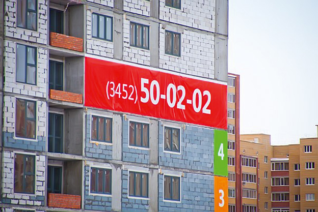 Дом обычно строится долго, а огромная серая стена выглядит уныло и непривлекательно. Поэтому мы решили, что ее можно и нужно использовать для продвижения. Разместите на стене огромный баннер, отражающий основные преимущества проекта. Или продвигайте отдельный продукт, например трехкомнатные квартиры, которые, как правило, продаются последними. Предлагайте хорошие двухкомнатные квартиры или специальные условия по ипотеке. А может, и другие продукты, которые вы считаете важными и привлекательными.