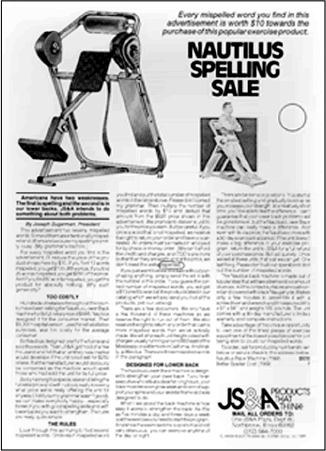 Итак, в июне 1985 г. я опубликовал следующую рекламу. Сочинять ее было одно наслаждение – намеренно искажать слова и перевирать грамматику. Почитайте это объявление и узнайте, как бы вы справились с орфографической распродажей тренажеров Nautilus.