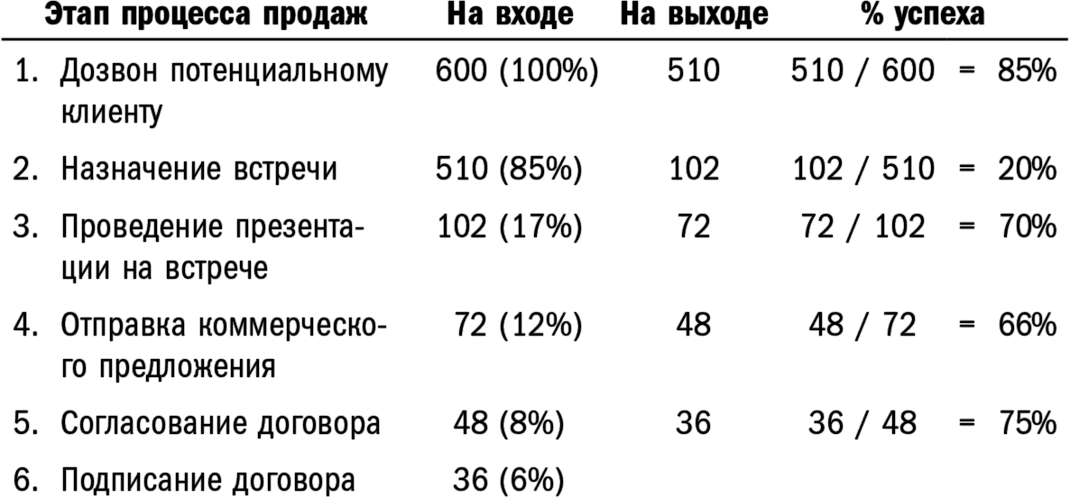 Цифры во втором столбце показывают (в абсолютных числах и в процентах), сколько потенциальных клиентов добрались от начала процесса продаж до этого этапа. Третья колонка показывает, сколько из них успешно прошли на следующий этап. И, наконец, четвертая колонка показывает, как мы подсчитываем процент успеха (или, как это называется на профессиональном языке, «процент конверсии», или «конверсию») для каждого этапа.