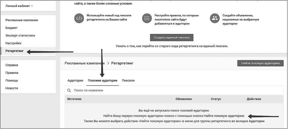 Меню «Ретаргетинг», «Похожие аудитории», «Найти похожую аудиторию». Принцип вам уже знаком.