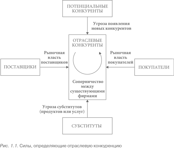 Интенсивность конкуренции в отрасли не является ни случайностью, ни невезением. Напротив, конкуренция в отрасли возникает из ее основополагающей экономической структуры и выходит далеко за рамки поведения действующих конкурентов. Состояние конкуренции в отрасли зависит от пяти основных конкурентных сил, представленных на рис. 1.1. Совокупное воздействие этих сил определяет конечный потенциал прибыльности в отрасли, измеряемый как долгосрочный показатель прибыли на инвестированный капитал. Не все отрасли обладают одинаковым потенциалом. Существенное различие по исходному потенциалу прибыльности наблюдается в них постольку, поскольку отрасли изначально отличны по совокупному воздействию указанных сил. Это воздействие может быть интенсивным, например в таких отраслях, как производство автомобильных шин, бумажная промышленность, черная металлургия, где фирмы не получают впечатляющих прибылей, и относительно умеренным в таких отраслях, как производство оборудования для нефтедобычи, косметических изделий и туалетных принадлежностей, сфера услуг, где высокие прибыли – обычное явление.