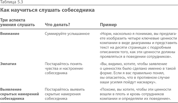 Эти навыки можно использовать и вместе, и по отдельности. В таблице 5.3 приводятся отдельные моменты нашей работы с неким генеральным директором. Он постоянно конфликтовал с коллегой (назовем его Норм) по поводу ценностей компании.