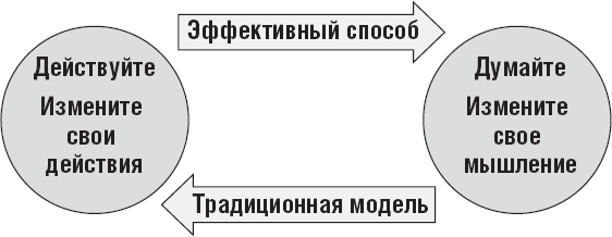 Аристотель говорил, что люди становятся добродетельными, творя добрые дела: иными словами, поступая правильно, вы сами становитесь лучше. Его мысль находит подтверждение в большом числе социально-психологических исследований, доказывающих, что сознание человека меняется, когда он начинает вести себя по-новому. Проще говоря, внешние изменения влияют на внутреннее состояние, а не наоборот (рис. 1–1). Ричард Паскаль, гуру менеджмента, формулирует эту мысль следующим образом: «Взрослые с большей вероятностью претворят новый образ действий в новое мышление, а не новое мышление в новый образ действий».