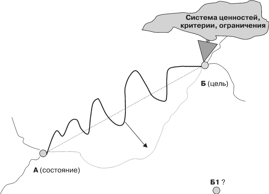 Следующий этап – задание цели, точки Б. Целеполагатель при задании цели (или диапазона возможных целей) ограничен собственной системой ценностей, хотя и не всегда это осознает. Желательно, чтобы у руководства фирмы была единая точка А и единая точка Б, потому что согласованность А и Б может привести к объединению усилий, а их рассогласование – к разбазариванию ресурсов.