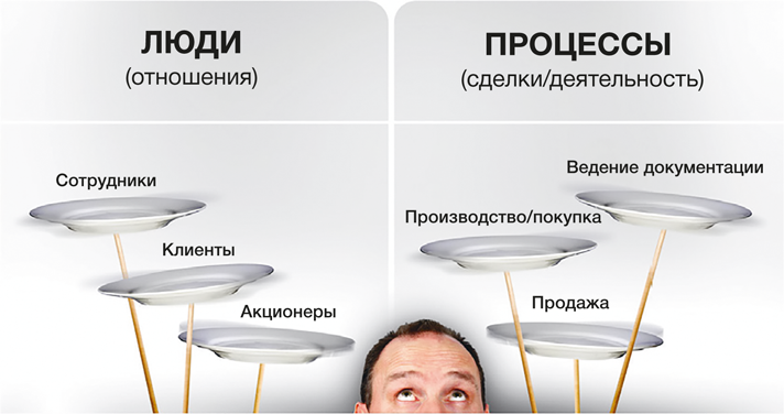 В правой части – список трех главных процессов, на которых строится любой бизнес: производство/покупка, продажа и ведение документации. Вы должны постоянно повышать продуктивность компании во всех этих областях и точно так же обеспечивать баланс их требований.