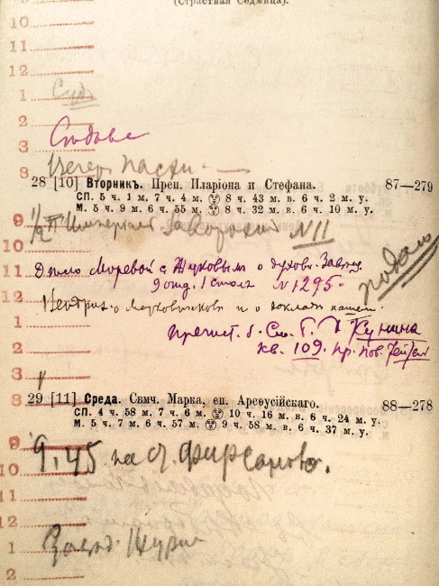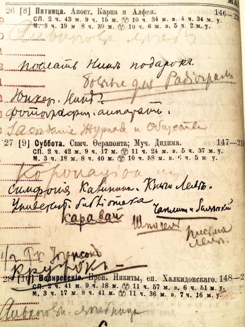 Весьма ценный экземпляр коллекции автора – «Календарь для врачей». Ценность в многочисленных записях, причем не «дневниковых», мемуарниковых, как часто бывает, а именно планировочных. График у доктора весьма плотный, он даже пропечатал все дни печатью с размеченной сеткой времени для жестких встреч – в те годы ежедневников с такой опцией не водилось. Почерк вполне «врачебный», но удается разобрать, что кроме приема больных в нескольких клиниках, визитов к больным на дом есть еще эпизоды, похожие на судебно-медицинскую экспертизу, и преподавание в Университете. В июле владелец ежедневника отдыхает в Вене, Ницце, Лионе, по ходу дела записывая расходы и подробности путешествия.