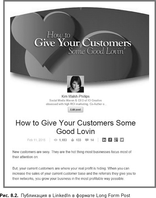 Воспользуйтесь возможностью делать в LinkedIn публикации в формате Long Form Post (рис. 8.2). Не тратьте на публикации много времени – лучше сфокусироваться на продажах, а не на написании постов. Просто вдохните жизнь в свой старый контент. Начните с написания введения к публикации в блоге или статье и разместите это вступление в формате Long Form Post.