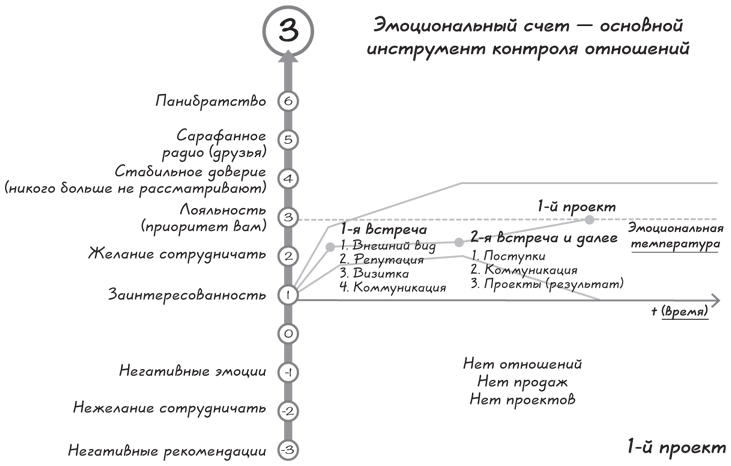 Повысить свой эмоциональный счет до этого уровня можно, например, выручив клиента в критической ситуации. Предположим, за три дня до мероприятия глубокой ночью вам в панике звонит клиент с новостью, что генеральному директору вдруг захотелось полностью поменять концепцию мероприятия и теперь нужно срочно все переделать. Конечно, вы можете найти предлог и сообщить, что поменять что-либо невозможно. Но будет гораздо лучше, если вы скажете: «Хорошо. Давайте решим эту задачу». Есть и более простые, но не менее действенные способы повышения эмоционального счета. Например, можно выполнить для клиента работу чуть раньше намеченного срока, но, конечно, без потери качества. Может быть, это мелочь, но клиенту будет приятно знать, что вы всецело погружены в его проект и идете с небольшим опережением графика. Положительно отразится на эмоциональном счете и простое поздравление клиента с профессиональным праздником, Новым годом или днем рождения.