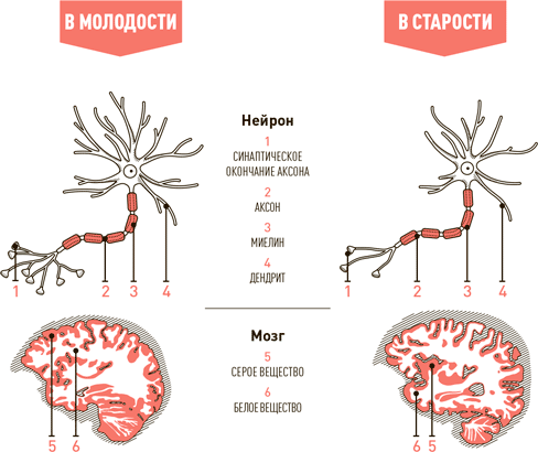 Начиная с 40 лет способность префронтальной коры мозга к передаче нервных импульсов слабеет. Кроме того, начинает разрушаться миелин — вещество, способствующее прохождению нервных импульсов, — рассказывает доктор медицинских наук Джордж Бартцокис, профессор неврологии в Калифорнийском университете в Лос-Анджелесе. Вдобавок принимается усыхать гиппокамп — структура мозга, ответственная за формирование и сохранение воспоминаний. Когда тебе исполнится 50 лет, начнет разрушаться белое вещество мозга — проводящие пути спинного и головного мозга. Высокое кровяное давление и высокий уровень холестерина в крови ускоряют эти процессы.