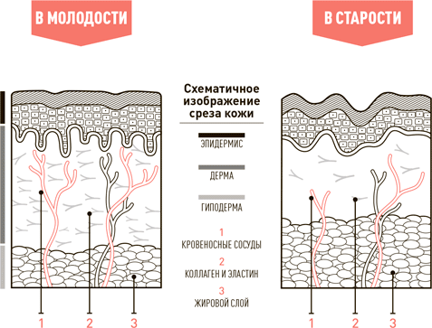 Более толстый слой дермы наполнен коллагеном и эластином, которые придают коже гладкость и упругость. На иллюстрации справа можно увидеть, как меняется эпидермис, когда жирный слой гиподерма разрастается, а кровеносные сосуды сжимаются