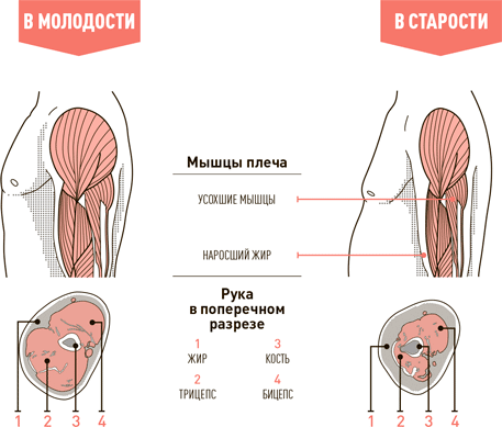 Большинство мужчин в возрасте между 30 и 50 годами теряют 2–4 кг мышечной массы. «Этот процесс ускоряется снижением уровня тестостерона и гормона роста, а также бездеятельностью и плохим питанием», — утверждает доктор наук Вильям Эванс, адъюнкт-профессор гериатрии в Университете Дьюка. Ниже ты найдешь изображения молодых и старых мышц.