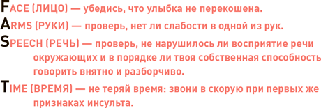 ? Чтобы без труда запомнить симптомы инсульта и алгоритм действий, используй аббревиатуру FAST[8]: