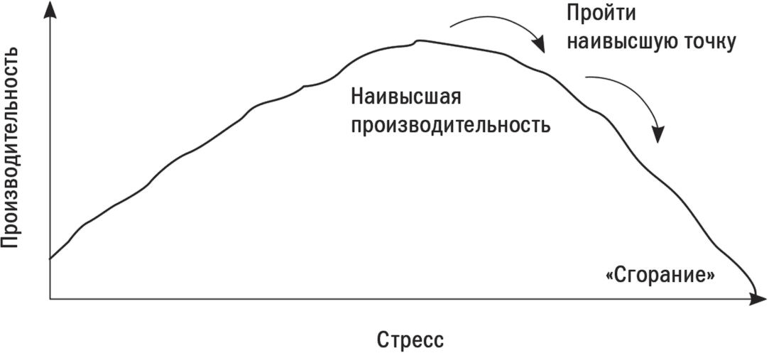 Определенный стресс (часто в форме позитивных стимулов или негативных последствий бездействия) необходим для того, чтобы повысить производительность. Без стресса нет движения, вы просто лежите на диване и жуете шоколад. Но как только начинаете испытывать давление, ваша производительность повышается, по крайней мере вначале. Наконец, вы достигаете точки (разной у разных людей), в которой дальнейшие требования в виде все большего числа решаемых задач или слишком сильной эмоциональной нагрузки начинают отрицательно сказываться на производительности. Это порождает еще больший стресс, ухудшает производительность и формирует неблагоприятный цикл в тот момент, когда вы проходите наивысшую точку кривой стресса. В редких случаях новый руководитель просто «сгорает» от переутомления. Чаще он оказывается в состоянии хронической неэффективности. Вы работаете больше и больше, а эффект от этой работы становится все меньше. Именно это и случилось с Киппом Эриксоном.