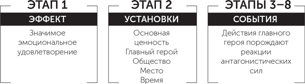 Если расчленить и проанализировать все хорошие истории, когда-либо придуманные людьми, можно выделить восемь основных компонентов сторителлинга, организованных в восемь этапов, охватывающих творческий процесс создания истории от начала до конца: