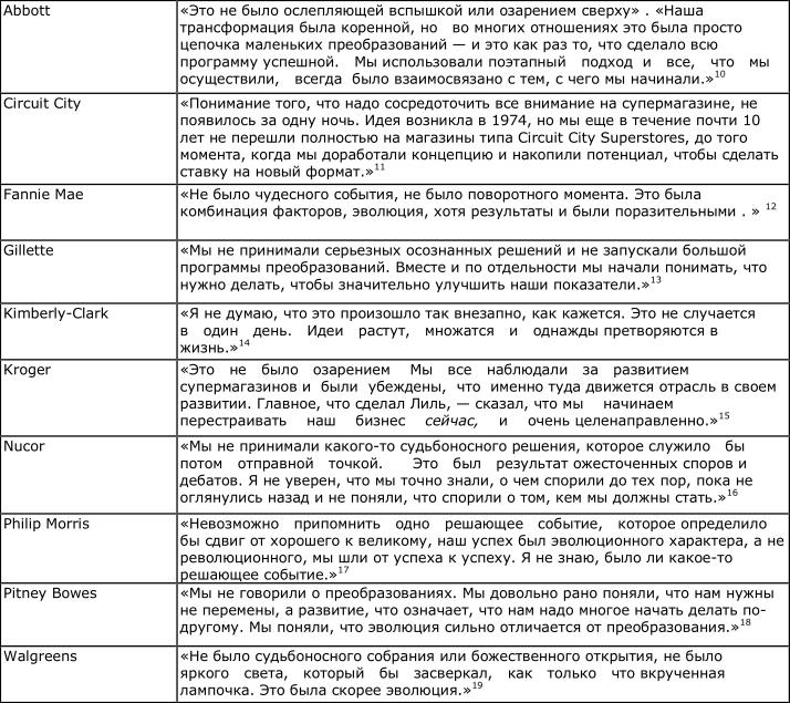 · Насколько бы значительными ни были конечные результаты преобразования компаний, которые добиваются выдающихся результатов, они никогда не делаются „одним махом“. Не было одного решающего мероприятия, не было суперпрограммы, не было одной убийственной новации, одинокого прорыва, чудесного момента.
