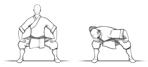 • Положите руки на бедра и нагнитесь вперед. Спина остается прямой. При этом выдохните.