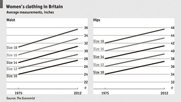Журнал Economist писал про инфляцию размеров женской одежды в Британии и США. Сегодняшний 14-й размер брюк на 4 дюйма шире в талии, чем в 1970 году. Женщины чувствуют себя лучше и покупают больше, думая, что они совсем не поправились.