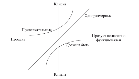 Некоторые требования не являются одноразмерными. Они отмечены на рис. 5.10 словами «должны быть» и «привлекательные». Кривая «должны быть» указывает на ситуацию, в которой клиент менее доволен менее функциональным продуктом, но более функциональным удовлетворен не больше. Некоторые компании называют эти должны элементы «неудовлетворители»: они могут не удовлетворить, но не могут увеличить удовлетворение.
