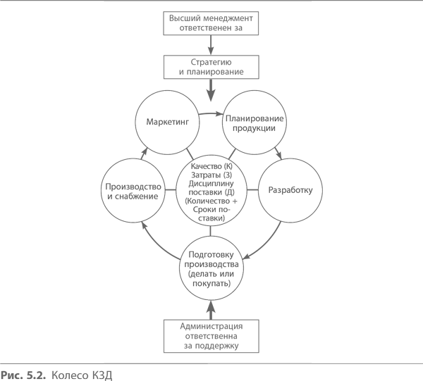 Следовательно, все прочие функции менеджмента мы должны расценивать как обслуживающие три первоочередные цели КЗД (качество, затраты, дисциплина поставки). В число таких вспомогательных функций входят планирование продукции, разработка, производство, снабжение и маркетинг, и их стоит рассматривать как вторичные средства достижения КЗД».