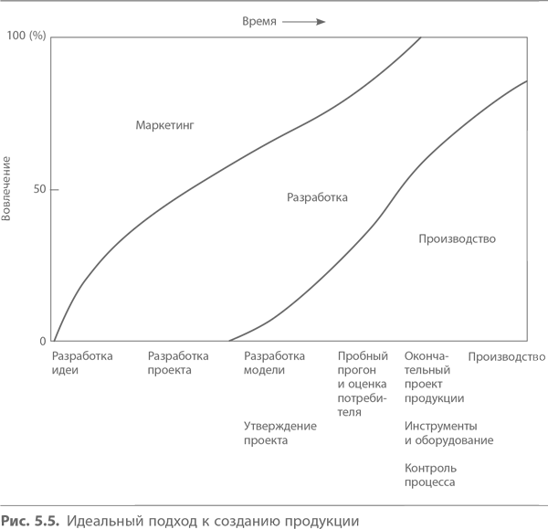 Идеальная ситуация при разработке новой продукции показана на рис. 5.5, где есть перекрытие функций на каждой стадии (подготовлено Тосиро Ивахаси из Kubota, Ltd). Межфункциональный менеджмент вырастает из потребности сломать коммуникационные барьеры между подразделениями. Однако, чтобы этого добиться, нужны система обеспечения качества и определенные правила, нормативы и процедуры.