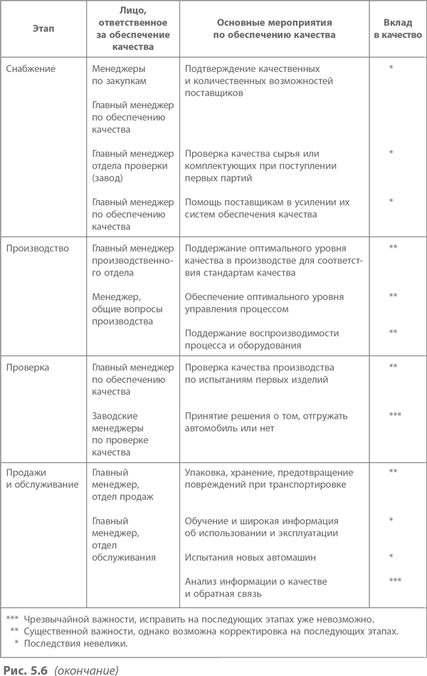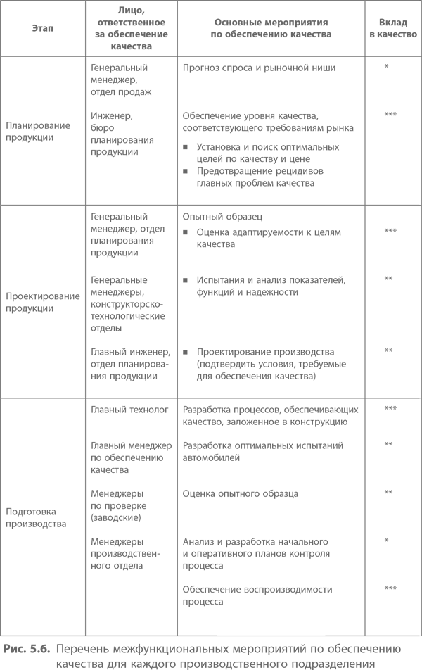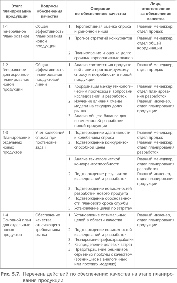 Ниже рассказывается, как применяются эти правила, и приводятся примеры проводимых мероприятий. Чтобы единообразить работу всех сотрудников компании, в инструкции есть пункт, согласно которому нужно стремиться к обеспечению качества, «при котором продукция удовлетворительна, надежна и экономична для потребителя». В этой связи для каждого функционального отдела Toyota разработала список действий по обеспечению качества (см. рис. 5.6). Рис 5.7, дополняющий эти правила, дает примерный список действий по обеспечению качества на этапе планирования продукции. Заметьте, что в нем перечисляются как сотрудники, ответственные за каждый этап, так и моменты, подлежащие контролю. Основная цель этих действий – никогда не причинять неудобств потребителю.
