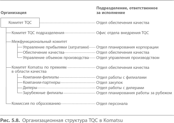 На рис. 5.8 представлена организационная структура TQC в Komatsu. Президент компании является председателем комитета TQC, а остальные члены исполнительного комитета автоматически становятся его членами. Как правило, заседания проводятся ежемесячно. На них на основе прошлогодней политики разрабатывается план мероприятий на будущий год, проверяется, как идет работа в каждом подразделении, и составляется график аудитов. Кроме того, комитет TQC контролирует работу других комитетов.