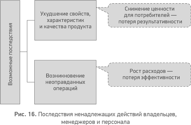 Ненадлежащие действия владельцев, менеджеров и персонала могут привести к двум нежелательным последствиям. Во-первых, к ухудшению свойств, характеристик и качества продуктов – к снижению их потребительской ценности и, следовательно, к потере результативности организации. Во-вторых, к возникновению неоправданных (дополнительных) производственных операций, которые, в свою очередь, ведут к повышению расходов, т. е. к потере эффективности (рис. 16).