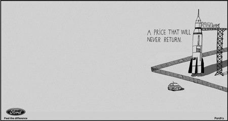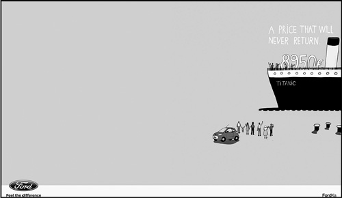 Этот же прием был использован и для рекламы Ford Ka (рис. 42, 43). Низкая цена автомобиля уже никогда не повторится. Так же как в свое время нам не суждено было увидеть повторно знаменитый «Титаник» или «Аполлон 13»[5].