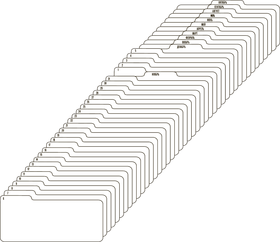 Как организовать систему напоминаний. Для создания физической системы напоминаний вам понадобятся сорок три папки: тридцать одна из них должна быть пронумерована от 1 до 31, а оставшиеся двенадцать назовите по месяцам года. Пронумерованные папки на каждый день ставятся первыми, начиная с завтрашней даты (если сегодня 5 октября, то номер первой папки – 6, а за ней – все остальные до 31). За папкой 31 располагается папка для следующего месяца («Ноябрь»), а за ней – папки от 1 до 5. За ними идут остальные папки по месяцам (с «Декабря» по «Октябрь»). Содержимое папки за следующий день ежедневно перемещается в корзину «Входящие», затем пустая папка ставится за последнюю из ежедневных папок (теперь папка за 6 октября становится папкой за 6 ноября). Точно так же, когда папка для следующего месяца достигает начала системы напоминаний (31 октября, после того как вы освободите ежедневную папку, первой будет располагаться папка «Ноябрь», а за ней – ежедневные папки с 1 по 31), ее содержимое переносится в лоток для входящих, а сама папка занимает место после всех ежемесячных папок и становится папкой для ноября следующего года. Такую систему можно назвать «вечной»: в каждый конкретный момент в ней содержатся папки на следующий тридцать один день и на следующие двенадцать месяцев.