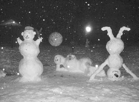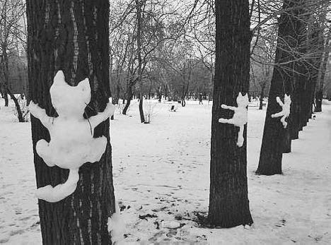 Побуждаем клиентов к творчеству. Можно объявить конкурс снежных фигур. Причем принимаются не только снеговики, но и любые скульптуры. Даже на деревьях. Примеры ниже.