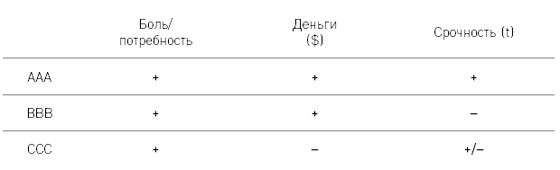 Если клиенту срочно, у него есть потребность и бюджет, то вас можно поздравить, перед вами клиент категории «А» (в таблице указано ААА, BBB и CCC для наглядности, никакого смысла повторение буквы не несет, просто глазам так удобнее воспринимать статус клиента, когда они смотрят в карточку сделки в CRM).
