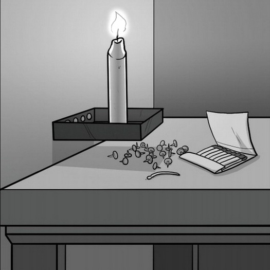 Вы сидите за столом, приставленным к деревянной стене, и экспериментатор дает вам предметы, изображенные ниже: свечу, коробку кнопок и коробок со спичками.