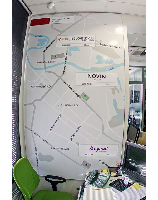 Следующее, на что стоит обратить внимание, – это карта проекта и карта проектов. Карта проекта формата А3 находится на столе у менеджера, на ней отображена схема проекта. По ней менеджер начинает свой рассказ о проекте в целом. Здесь должны быть отмечены все дома, их разбивка на очереди, объекты социальной и коммерческой инфраструктуры. Еще хорошо, если карта показывает и окружение проекта. То есть нужно показать, где автобусная остановка, ближайший детский сад (школа), поликлиника или другие значимые объекты, например река. Карта проектов, как правило, изображена на карте города и висит на стене в офисе продаж. Ее размер может быть любым, но лучше всего, когда она занимает большую часть центральной стены и демонстрирует ваш масштаб и охват города в разных районах. На ней могут располагаться разные метки – объем застройки и сроки реализации проекта, удаленность от центра города и знаковых объектов.