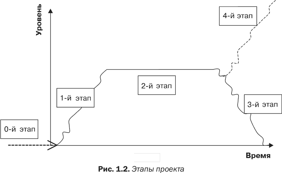 Проект имеет сроки начала и завершения, ожидаемые результаты, этапность и прочие параметры, позволяющие его остановить, изменить, заморозить, закрыть (рис. 1.2). Проект не вечен, мы не рабы проекта, и это замечательно. Точно так же человек, находящийся в командировке, не будет каждый вечер таскать кресло с работы в гостиницу. Он ведь не за кресло подержаться приехал, добьется результата – и домой.