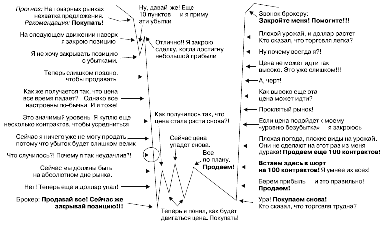 Взгляните на рисунок ниже: он хоть и в шуточной форме, но верно отражает то, что происходит в головах трейдеров по мере изменения рыночной конъюнктуры. Мысленные счета (точнее, нежелание смириться с их отрицательным закрытием) определяют решения трейдера, а вовсе не процентные ставки, размеры ВВП, финансовые показатели и прочие рациональные данные.