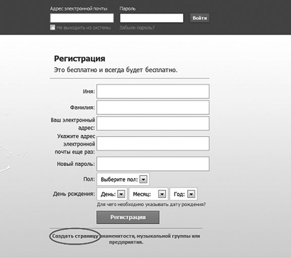 Шаг 2. Если вы не зарегистрированы и у вас нет собственной учетной записи, нажмите на ссылку внизу с надписью «Создать страницу».