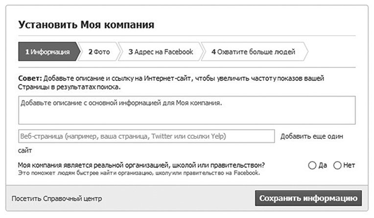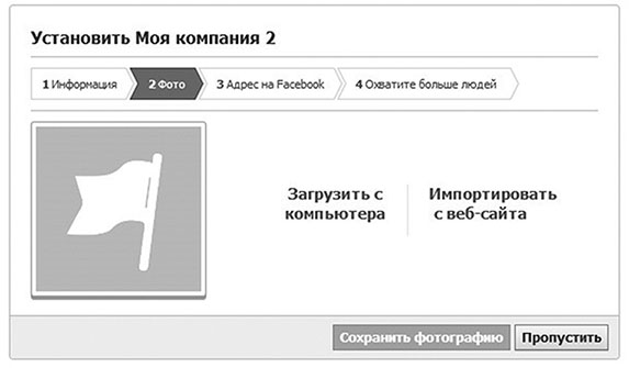 Шаг 6. После того как зарегистрируете страницу, Facebook предложит написать краткую информацию о вашей странице и установить фотографию для вашего сообщества (логотип компании), которую можно загрузить с компьютера или с вашего веб-сайта. Вы можете сейчас пропустить эти шаги и вернуться к ним позже, когда страница будет создана окончательно. Более подробно про оформление страницы мы поговорим дальше, в соответствующей главе. Когда фотография будет загружена, нажмите кнопку «Продолжить».