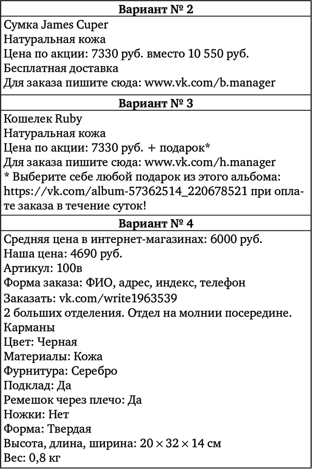 Таблица 4. Варианты подписи фотографий в альбоме с товарами