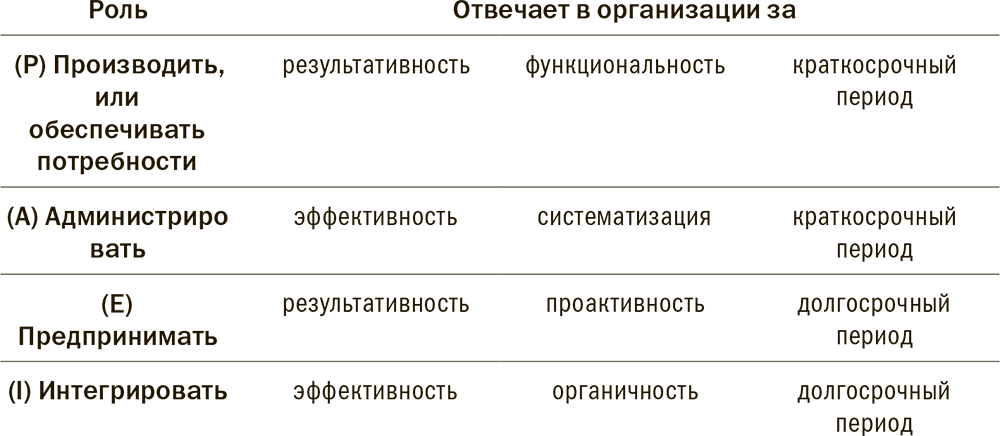 Если PAEI-роли выполняются как следует, организация станет результативной и эффективной как в краткосрочном, так и в долгосрочном плане. Она будет хорошо управляться. Она будет пребывать в расцвете.