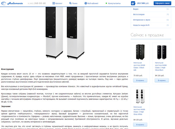 На сайт «Аудиомании» частенько приходят читать обзоры акустических систем или электроники. Мы не продаём обзоры и не получаем деньги за их прочтения, поэтому наша задача – познакомить посетителя с нашей компанией. Ведь он не просто так читает обзор какого-то товара, возможно, он хочет купить его в будущем. Нужно, как минимум, донести до него информацию, что на данном сайте можно не только обзоры почитать, но и купить. Если товар есть в наличии, то надо прямо так и написать, поставить на него ссылку, снабдить фотографией и ценой. Мы публикуем такой блок в правой колонке, в блоке «Сейчас в продаже». Возможно, окажется полезным показать какой-то необычный, но очень интересный и, безусловно, очень нужный товар.