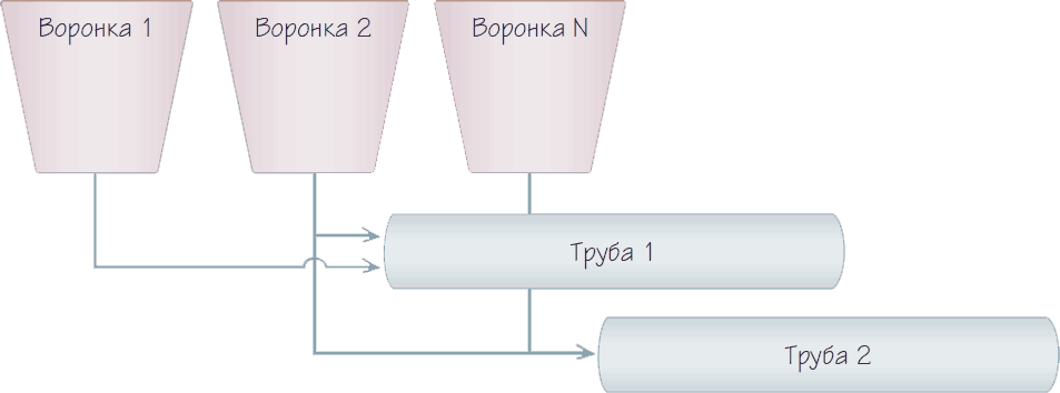 В одну «трубу» могут поступать заявки из нескольких «воронок». Верно и обратное: одна «воронка» может поставлять заказы в несколько «труб» (рис. 16).