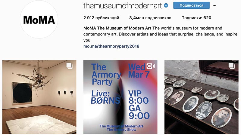 Аккаунт МоМА – Музея современного искусства. Профайл представляет художественную ценность сам по себе