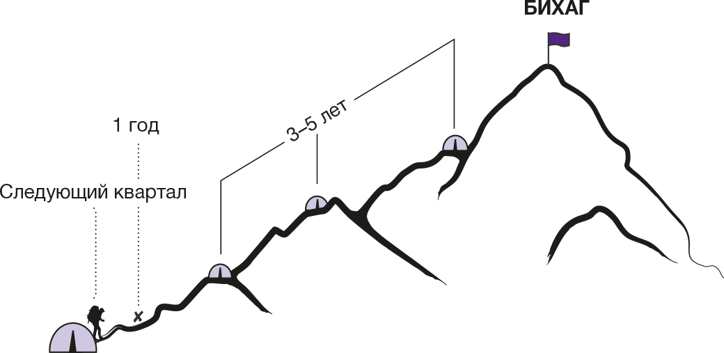 То же самое происходит и с организациями. Вооружившись основными ценностями и задачами, организация ставит перед собой БИХАГ (Bid Hairy Audacious Goal, или BHAG[4]), к которой она будет стремиться следующие 10–25 лет. Чтобы разделить это путешествие на более мелкие этапы, руководители компании задают целевые уровни результативности для каждых трех – пяти лет работы, а затем разбивают их на ежегодные цели и задачи. Они, в свою очередь, делятся на еще более мелкие этапы – конкретные действия, которые нужно совершить за следующие несколько недель или месяцев и которые можно корректировать в соответствии с рыночными условиями.