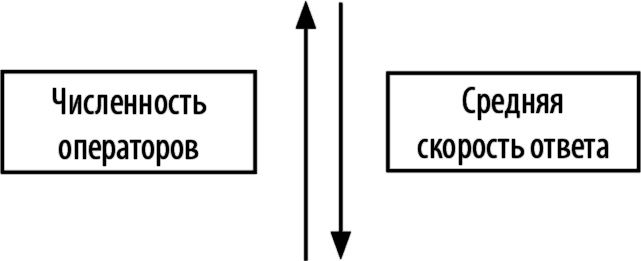 Как видите, очень похожая ситуация, аналогичная зависимости уровня обслуживания от загруженности операторов. И в этом случае управляющему персоналу операторских центров точно так же приходится балансировать между поддержкой низкой скорости ответа и разумным размером штата операторов.